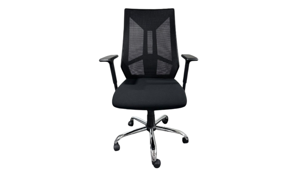 - Silla ergonómica con respaldo medio en malla y asiento en tela mallada color negro.