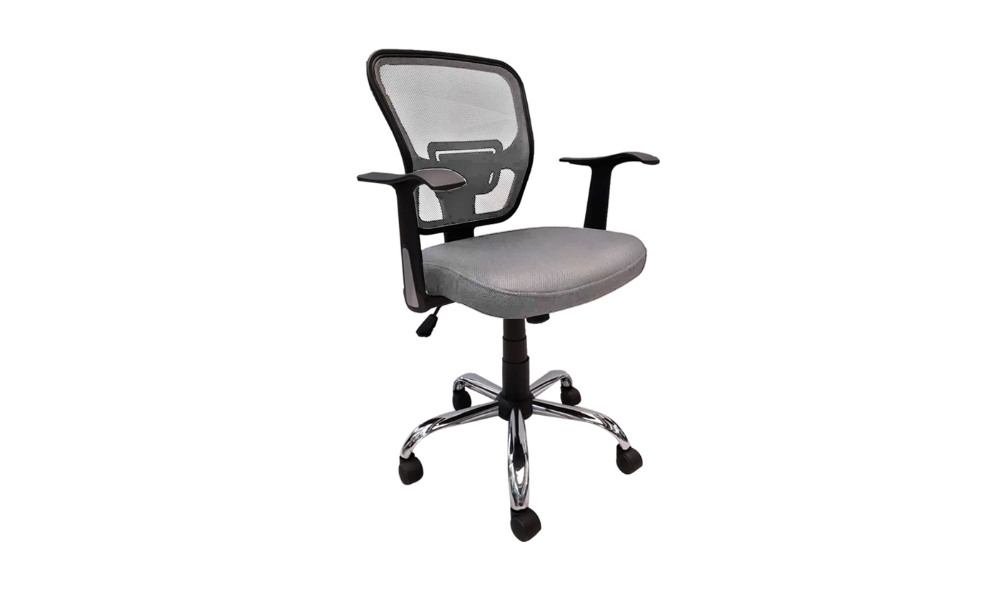 - Respaldo bajo en malla y asiento en tela mallada color gris.